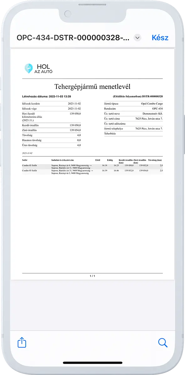 Egy gombnyomással olyan útnyilvántartást hozhatsz létre, amelynek elkészítése korábban sok hasznos időt emésztett fel. Ez az idő jutalom a hasznosabb vagy pihentetőbb tevékenységekre és nem kell többé a végtelen papírmunkával idegeskedni, amely korábban csak feltartotta a munkát és bevételt sem generált.