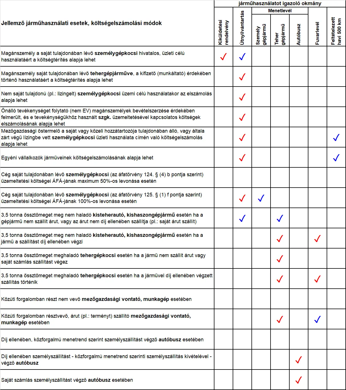 Az 1. esetben a költségtérítés alapja kiküldetési rendelvény vagy útnyilvántartás lehet, a további esetekben a magánszemély (egyéni vállalkozó, őstermelő) a jövedelemszerző tevékenységéhez használt saját gépjármű költségelszámolásához szabályos útnyilvántartás vezetésére kötelezett, ha nem az 500 km-es átalányadózást választja.